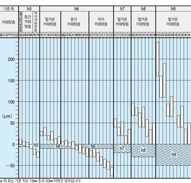 이것은 홀(구멍)을 기준으로 끼워맞춤에서 공차역의 상호 관계를 나타내는 표입니다. (규격표)