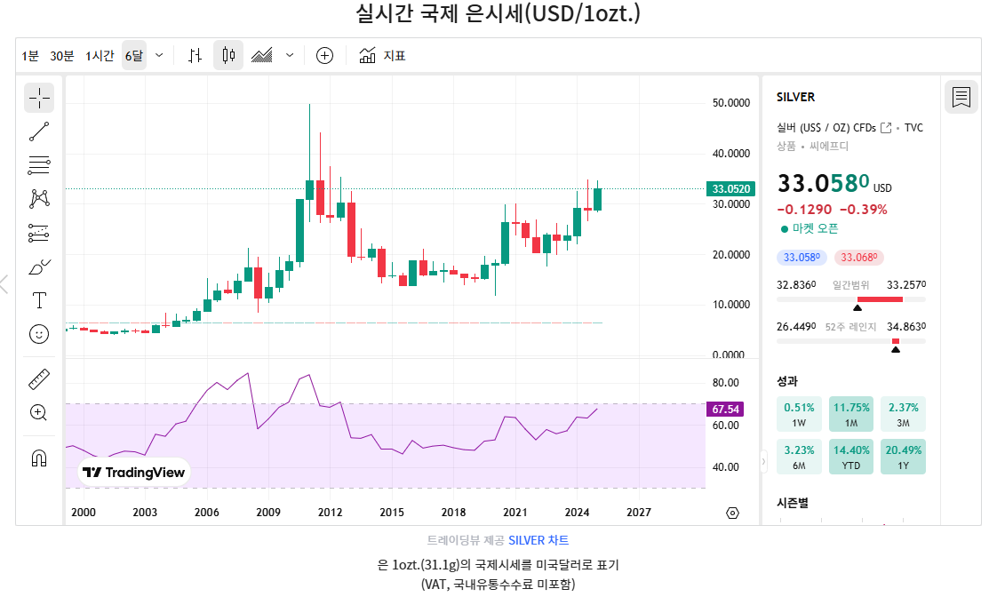 - 현재 은 가격: 온스당 $33.29 (약 0.39% 하락)